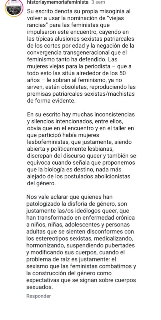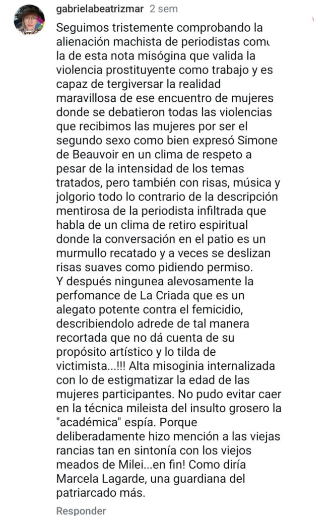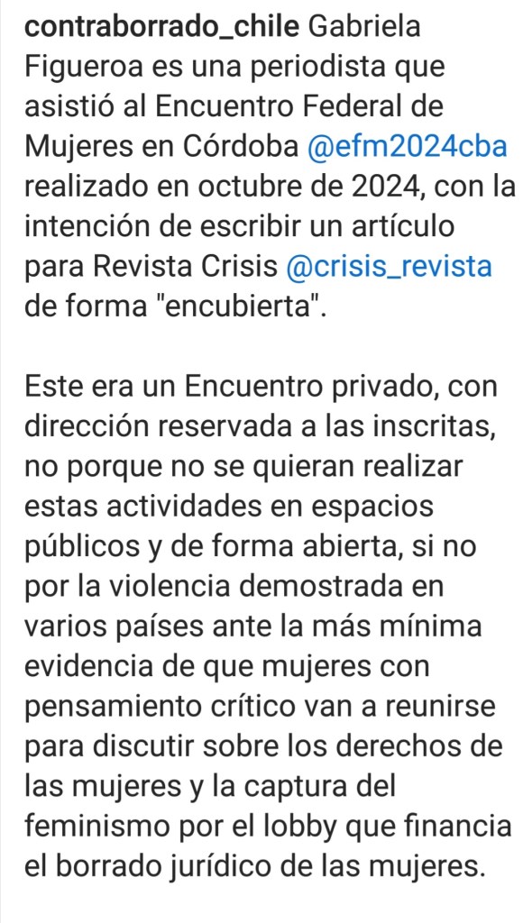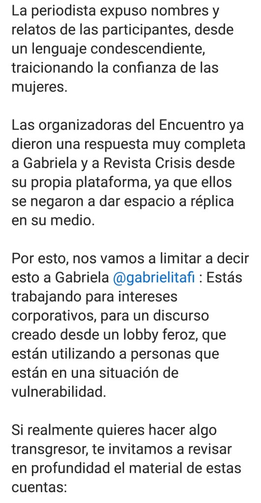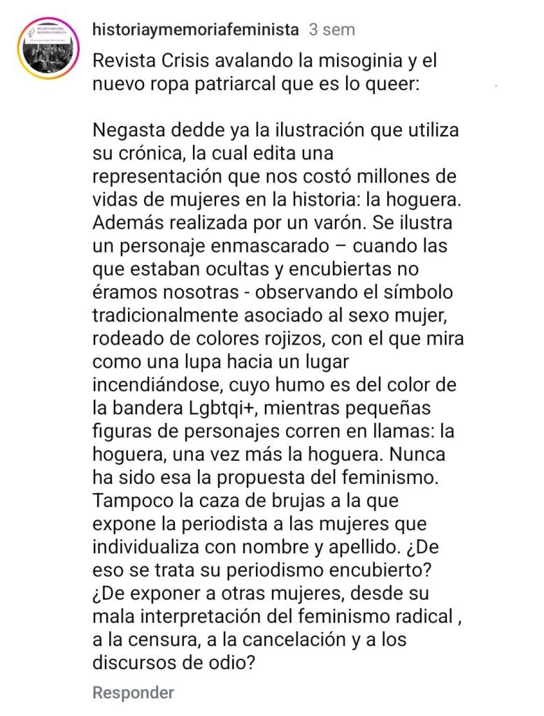 El presente texto de respuesta a la nota de Gabriela Figueroa en la Revista Crisis del día 3 de diciembre 2024 y reiteradamente difundida por redes sociales, por dicha revista, en el mes de febrero 2025. Habiéndose comprometido el colectivo editorial a publicar la nota con carácter de «derecho a réplica» y al no cumplir dicha acción, la damos a conocer por nuestros propios medios confiando en el debate democrático.